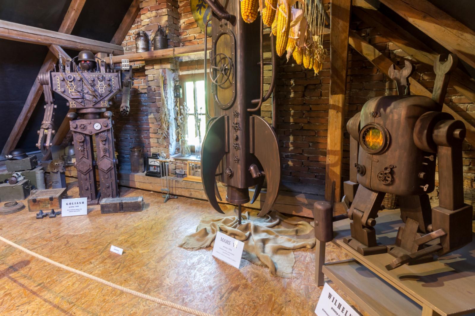 You will see robots, submarines, airships and other sculptures and exhibits inspired by the world and works of Jules Verne, Karel Zeman and Karel Čapek. The largest ones are up to 3 metres tall and will transport you back to your childhood, to the time when you used to flip through books like Twenty Thousand Leagues Under the Sea or The Invention of Doom. A bonus is a smaller armoury of film props.