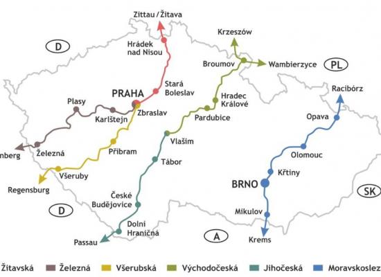An east–west variant of the St. James’ Way has also been proposed, leading from the Slovak town of Šaštín through Velehrad to Brno. From there, the route can continue westwards to Třebíč and across the Vysočina region to Český Krumlov, where it joins the St. James’ Way coming from the Broumov region via Vlašim and Tábor. The Velehrad–Brno–Třebíč section likewise follows existing Czech Tourist Club trails (with the exception of a short passage through Brno itself).